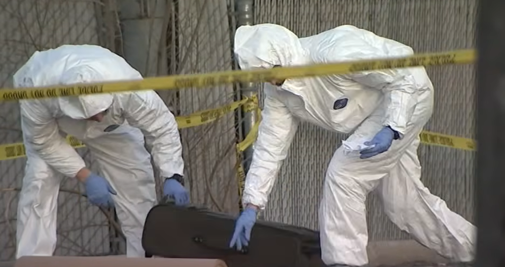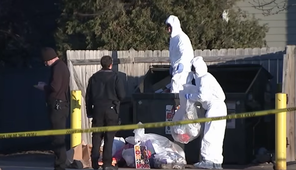 Investigators were seen searching through trash bins and collecting multiple bags of evidence.