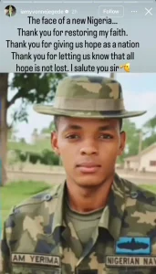 “The face of a new Nigeria… Thank you for restoring my faith. Thank you for giving us hope as a nation. Thank you for letting us know that all hope is not lost. I salute you, sir.”