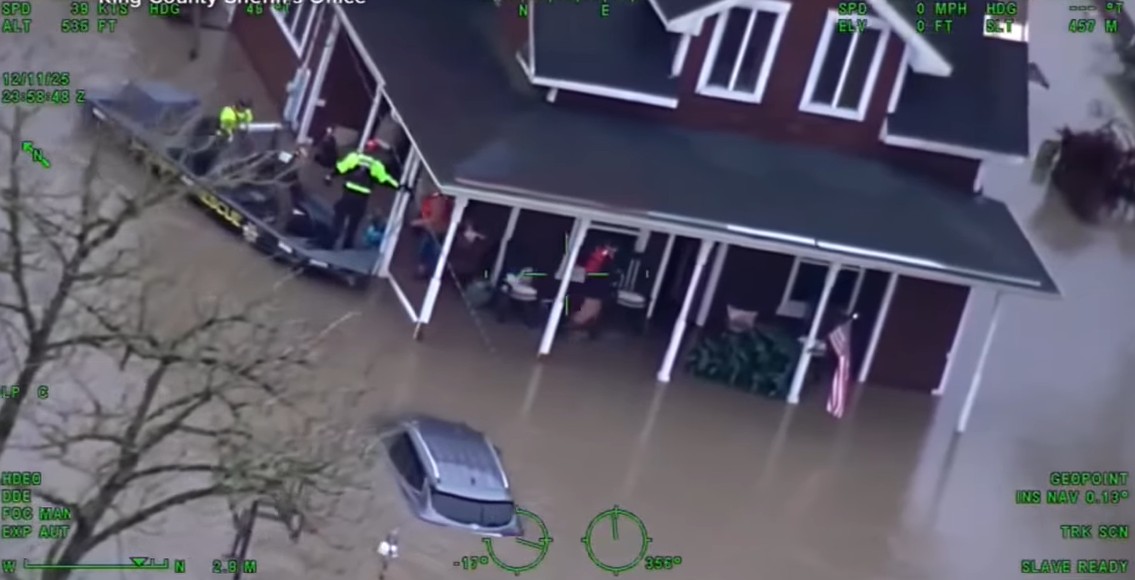 The deluge caused rivers to swell, forcing dramatic rescues. In one instance, a King County Sheriff’s Office marine rescue team had to use a boat to rescue Eddie Wicks, his wife, and their dog from their Washington farm, which had been transformed into a lake. The moment the water engulfed their home was captured on video.