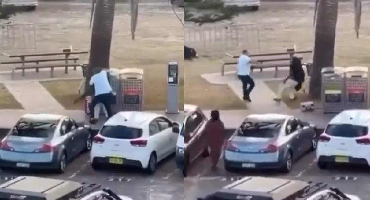 The hero, an unnamed man wearing a white shirt and black pants, crept up behind a parked car in the Campbell Parade car park. He pounced on the gunman, who wore a black shirt and white pants and carried a black bag.