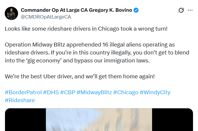 “If you’re in this country illegally, you don’t get to blend into the ‘gig economy’ and bypass our immigration laws,” Bovino posted.