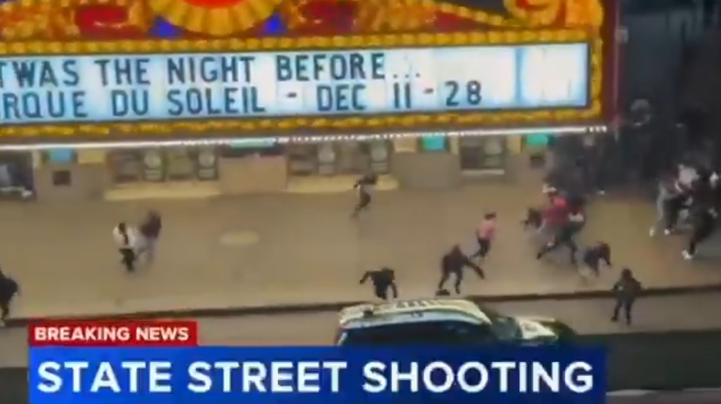 Photo of police responding to the mass shooting and riot near the Chicago Theater marquee after the Christmas tree lighting.