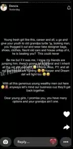 “With all these generous young wealthy men out here… dear young girls, I promise you, you have many options and your grandpa ain’t one,” Dencia concluded.