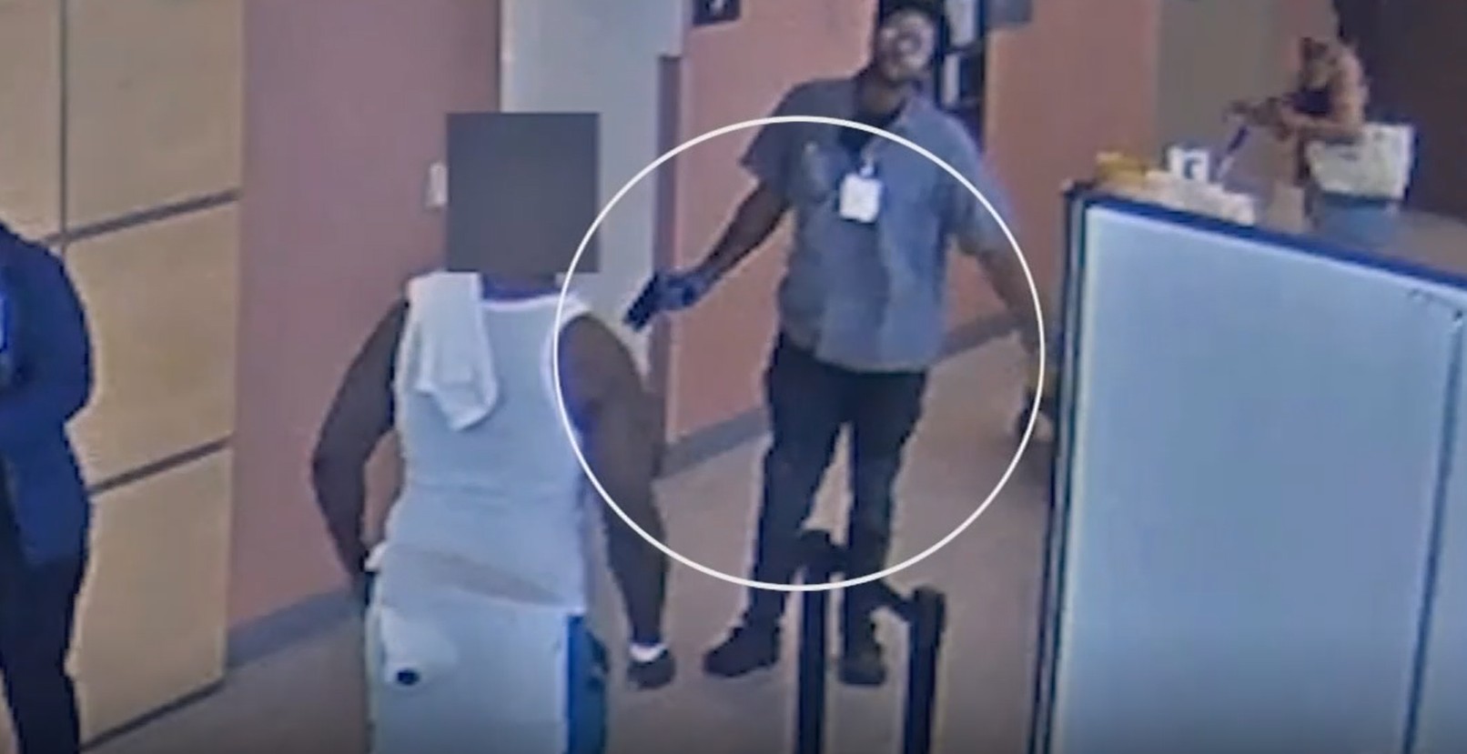 Surveillance video shows Rhymes, who was working as a food service contractor at the time, engaging in a heated altercation with a patient.
