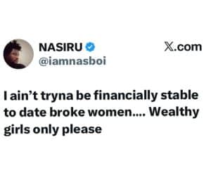 In a post shared on his official X account, the popular entertainer stated that his goal of becoming financially stable isn’t so he can date women who rely on him, but rather to attract women who are already wealthy and successful.