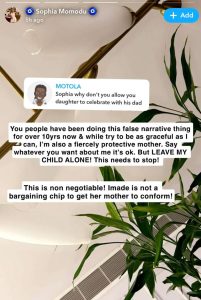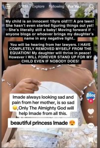 “You people have been doing this false narrative thing for over 10 years now. And while I try to be as graceful as I can, I’m also a very protective mother. Say whatever you want about me, it’s ok. But leave my child alone. This is non-negotiable. Imade is not a bargaining chip for her mother to conform.”