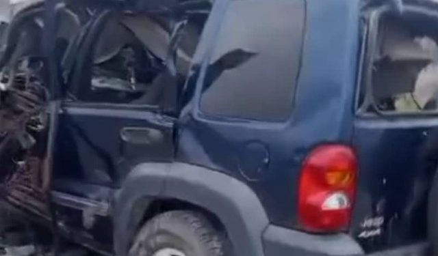 A Mitsubishi pick-up van (registration: AKD 733 JM), traveling at high speed, lost control and slammed into parked construction equipment.