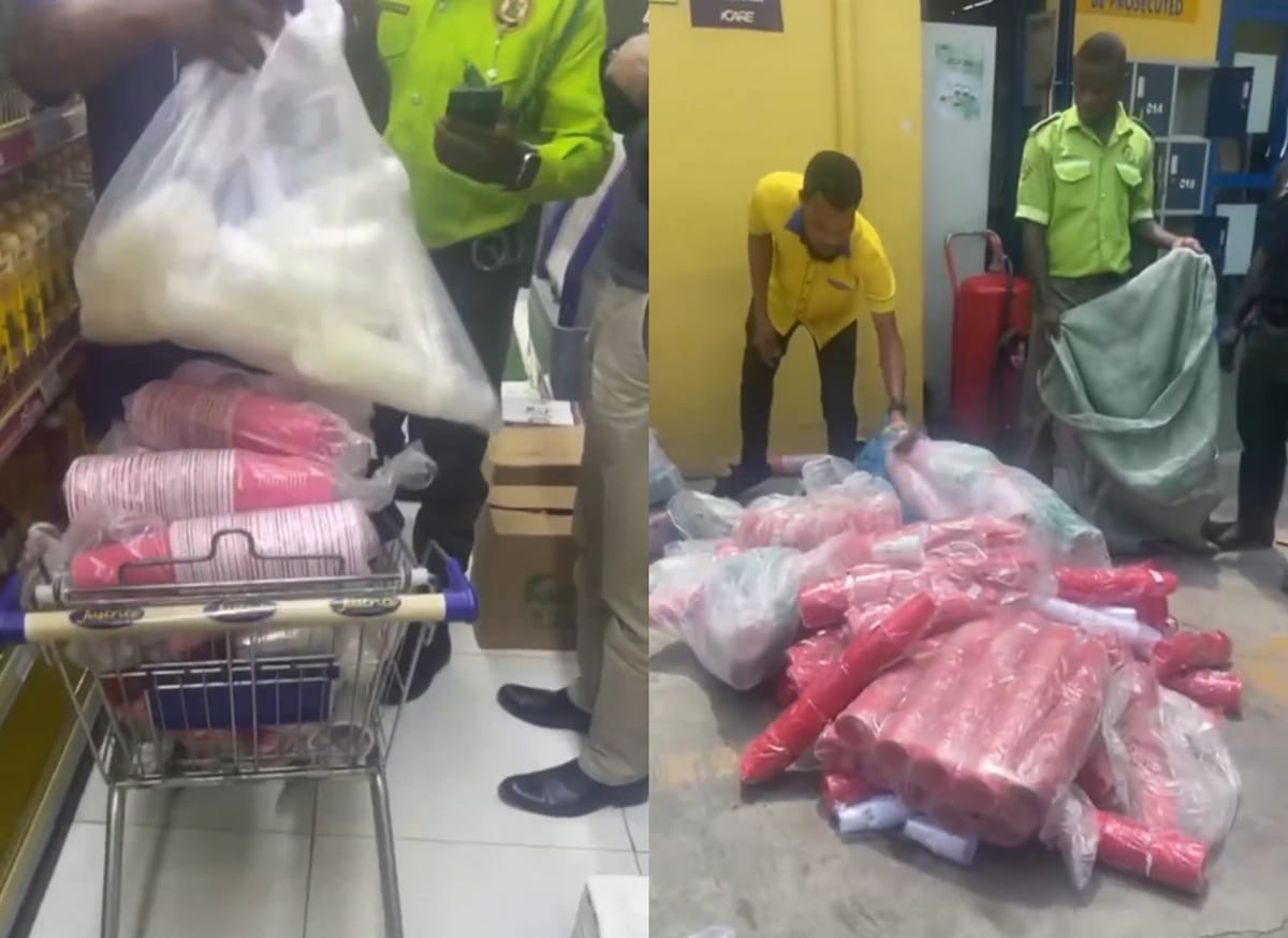 Lagos enforcement officers confiscating red plastic cups and pink plastic bags at Justrite Supermarket in Lekki.