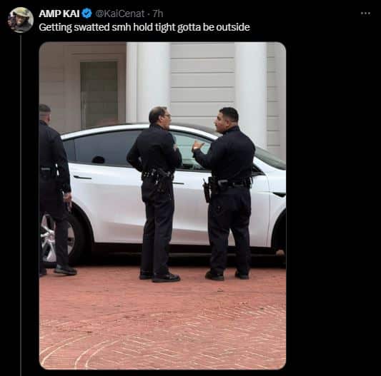 In the recent swatting scheme, He posted a photo of police at his mansion on X, saying, “Getting swatted smh hold tight gotta be outside.”