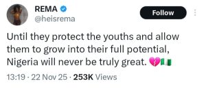 Nigerian music superstar, Divine Ikubor, popularly known as Rema, has added his voice to the growing concerns about the state of the nation, urging leaders to prioritize the safety and development of young people.