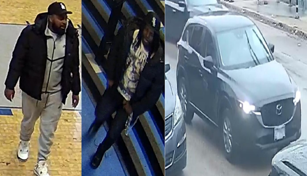 Suspect 2: A Black male with a heavy build, short hair, and a medium beard. He was seen in a black baseball cap, a black puffy jacket over a gray hooded sweatshirt, gray sweatpants, and white gym shoes.