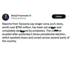 On Thursday morning, social media went into a frenzy after a post on X claimed that Juma Jux’s luxury fashion store allegedly valued at over $780 million had been set ablaze by angry demonstrators amid political tension in Dar es Salaam.