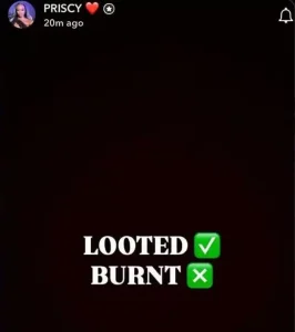 However, Priscilla took to Snapchat to debunk the story, clarifying that while there was minor looting during the protests, the building itself was never burnt down.