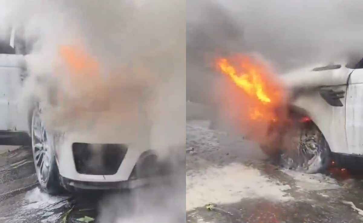 A video shared on X shows thick smoke and fire coming from the car’s front as people rushed to put it out.