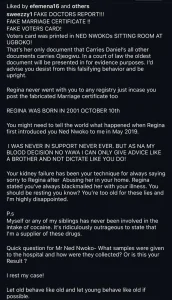 He further cast doubt on the authenticity of Regina’s alleged marriage certificate, insisting she never went to any registry with Ned. Swezzy also recalled that he never supported the union when it was first proposed in May 2019.