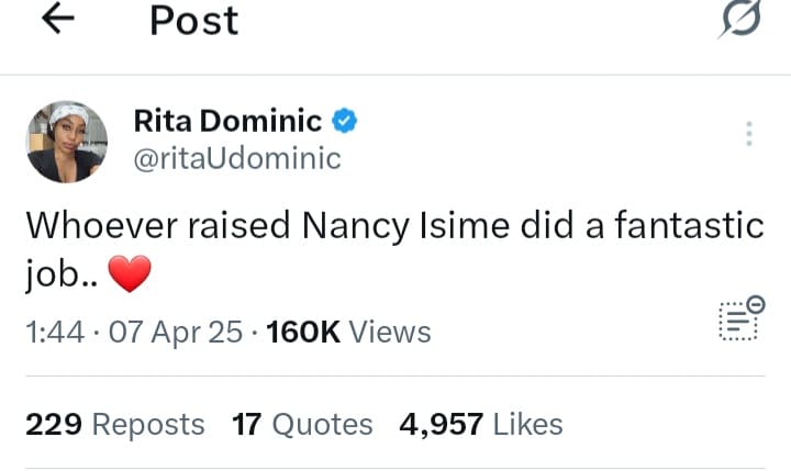 In a heartfelt post on her official X (formerly Twitter) account, Rita Dominic did not hold back her admiration. “Whoever raised Nancy Isime did a fantastic job,” she wrote, emphasizing how the foundation of character often begins at home. The post quickly went viral, sparking a wave of support from fans, celebrities, and followers who echoed Rita’s sentiments.