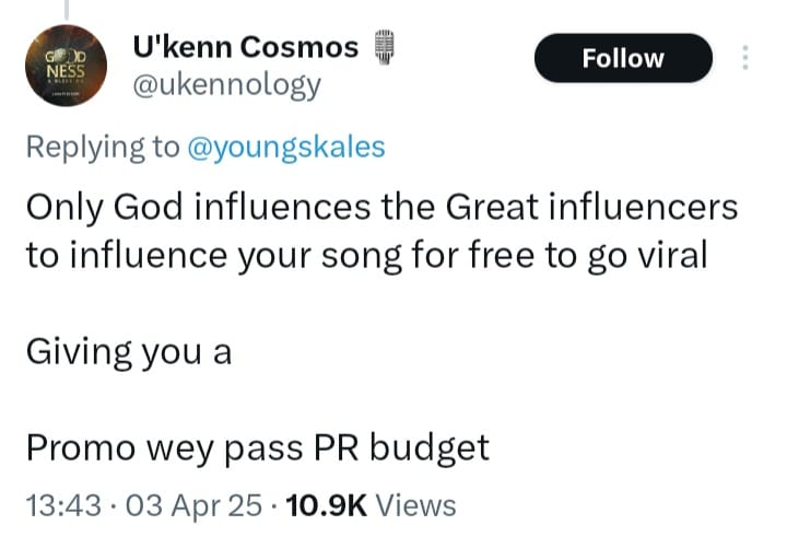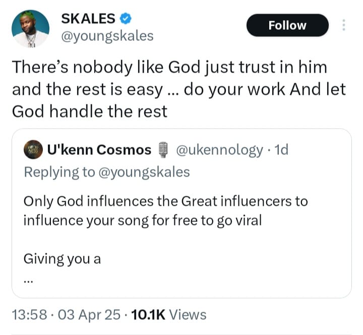 Reacting to the unexpected resurgence, Skales took to Twitter to share his gratitude and faith. A fan had tweeted, “Only God influences the great influencers to influence your song for free to go viral. Giving you a promo wey pass PR budget.” The singer responded humbly, saying, “There’s nobody like God. Just trust in Him and the rest is easy… do your work and let God handle the rest.”