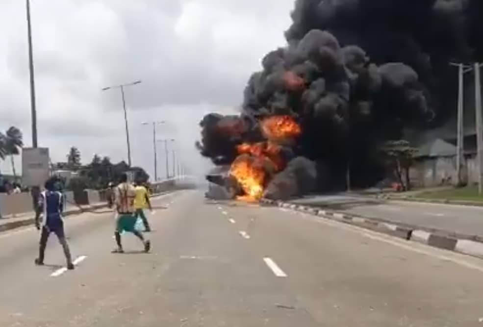 A tanker carrying diesel flipped over and burst into flames on the Apapa-Oshodi Expressway at Iyana Isolo, heading toward Oshodi.