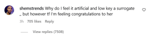 “Why do I feel like it is artificial and low key a surrogate but however the f*** I’m feeling congratulations to her,” the comment read.