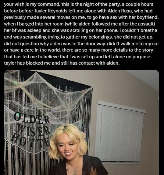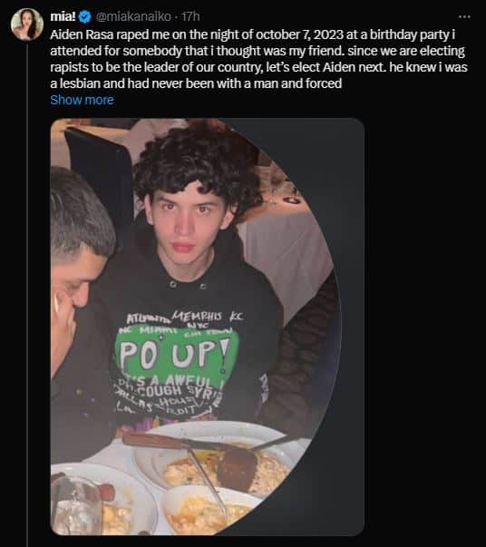 A viral post on X (formerly Twitter) by user @miakanaiko, a young woman identifying as part Japanese and Salvadoran, details a distressing allegation against a man named Aiden Rasa.